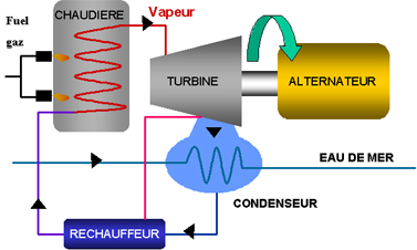 Elle consiste à produire de la vapeur au moyen d'une chaudière fonctionnant à l'origine au charbon, et de nos jours au fuel lourd ou au gaz. La vapeur ainsi produite fait tourner une turbine, qui n'est finalement rien d'autre qu'une sorte de moulin évolué. La turbine entraîne la machine capable de produire réellement l'électricité : l'alternateur, ainsi nommé parce qu'il produit du courant alternatif.